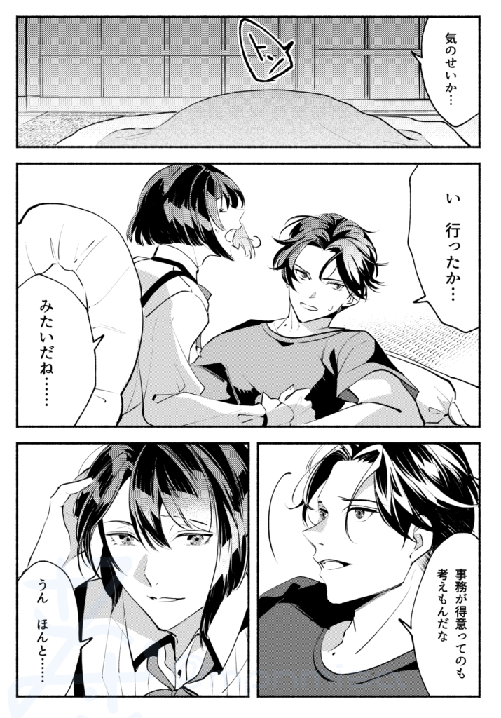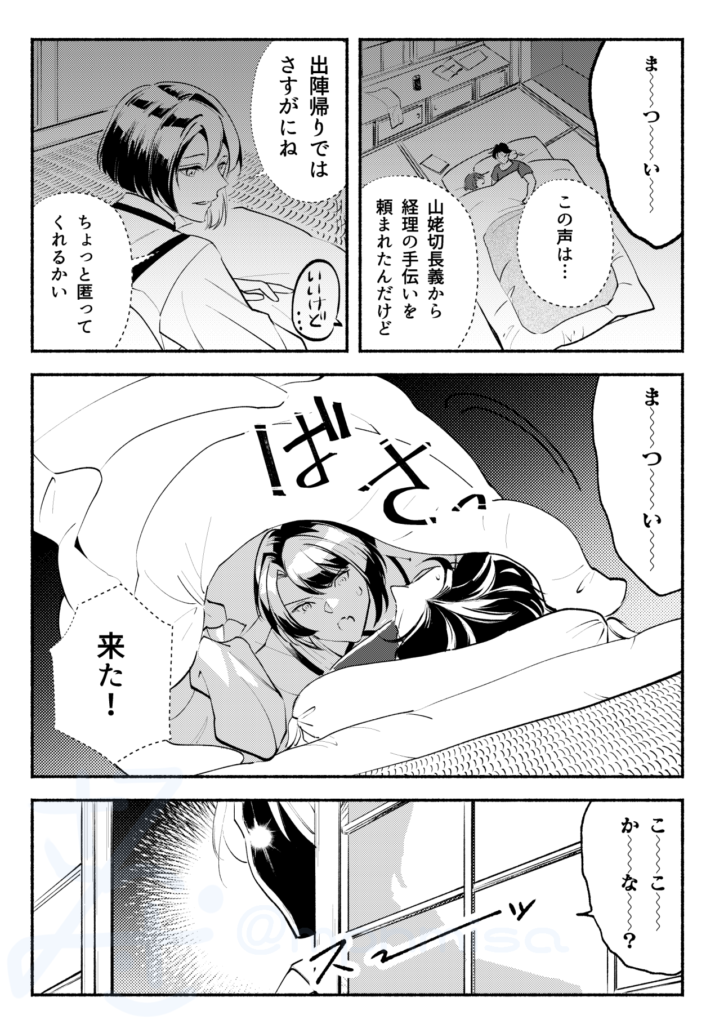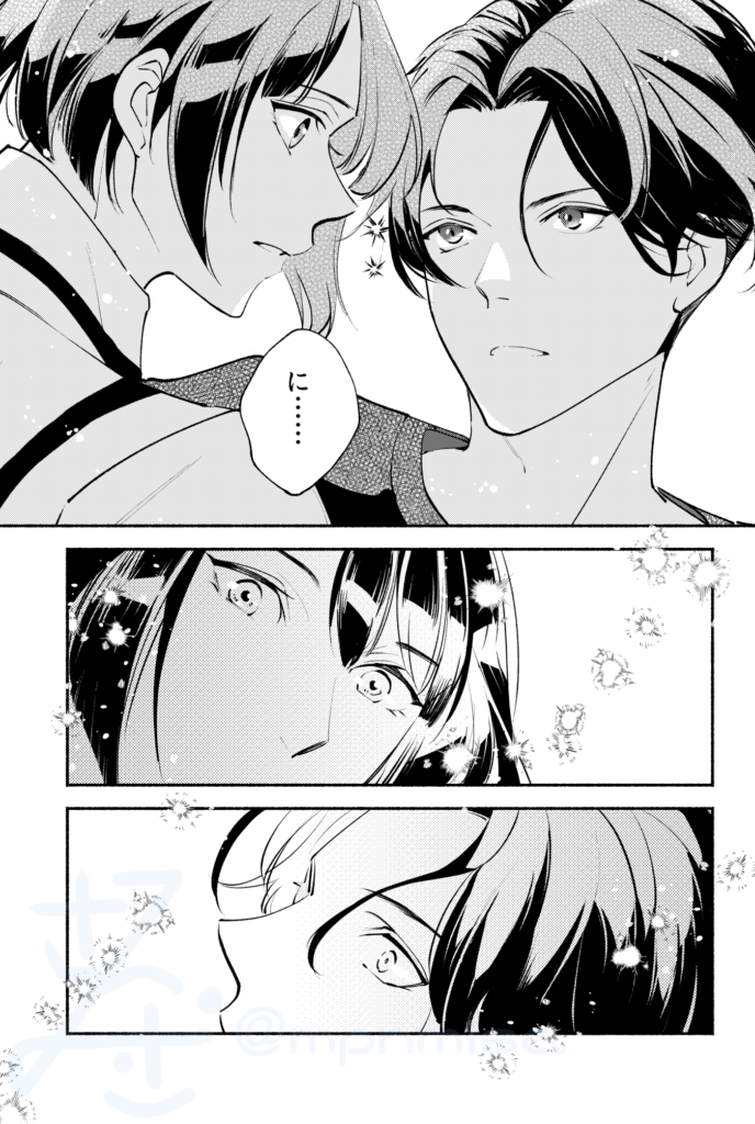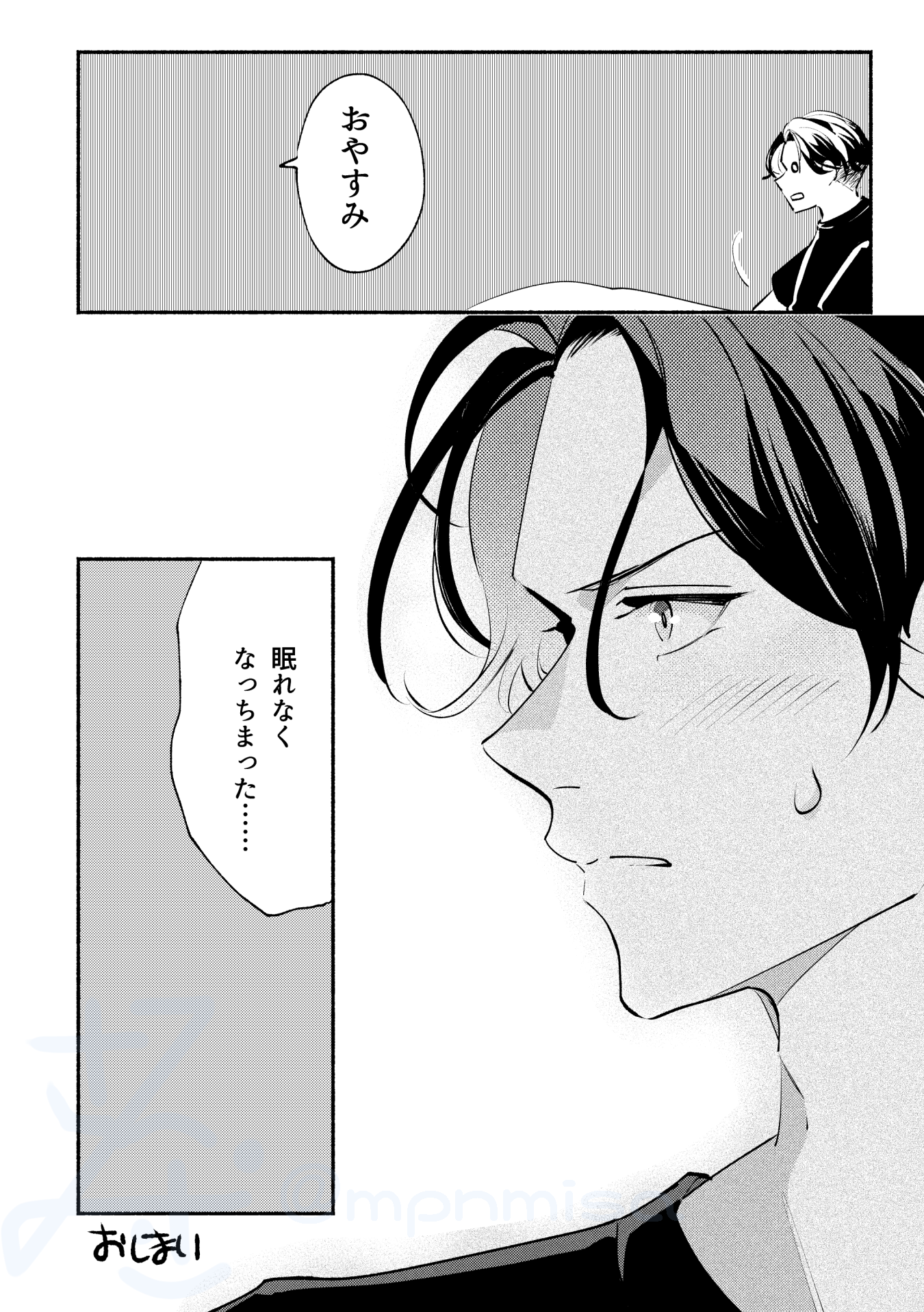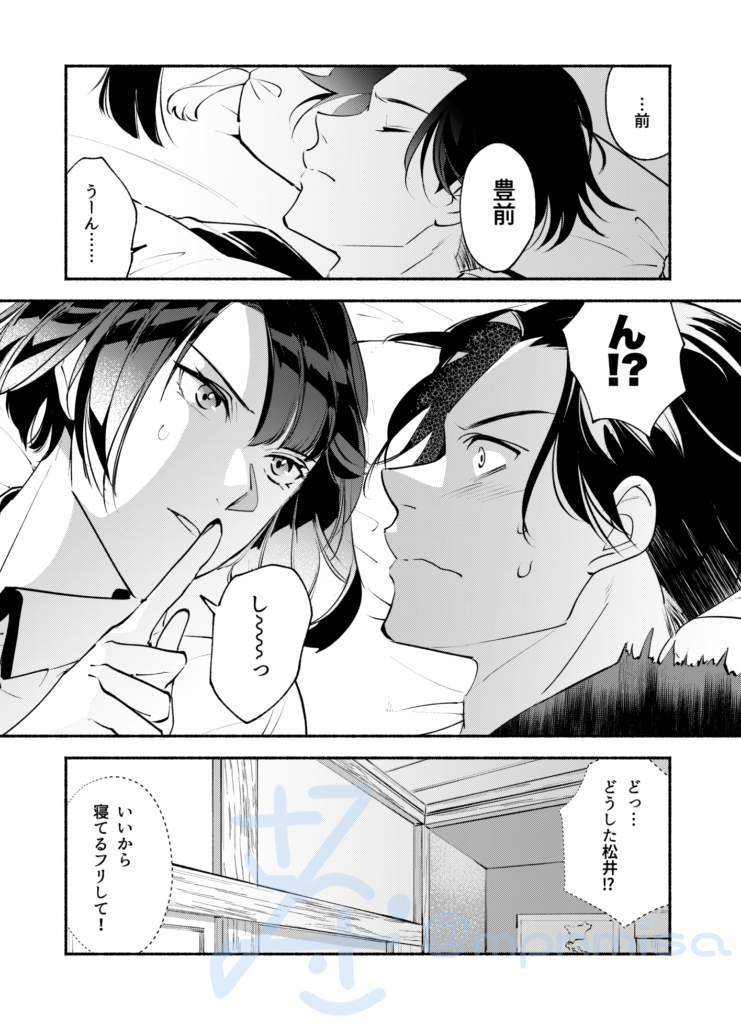 投稿者: mpnmisa2025年3月6日2025年3月6日 風邪を引いて寝てた時に浮かんだぶぜまつ漫画です。2020年に1冊本を出して以降久しぶりに描いた!豊前みたいなスタンダードなイケメンは普段あんまり描くことがないので、ぶぜまつ描くと楽しいな〜ってなります。松井が極まったら回想74の続きは果たして来るのだろうか・・?!