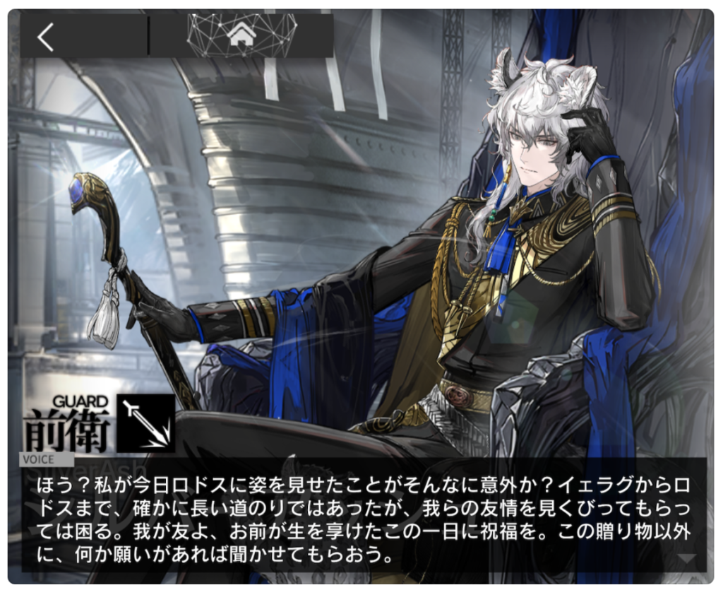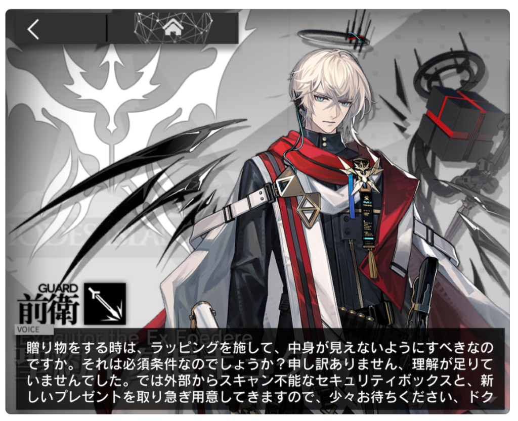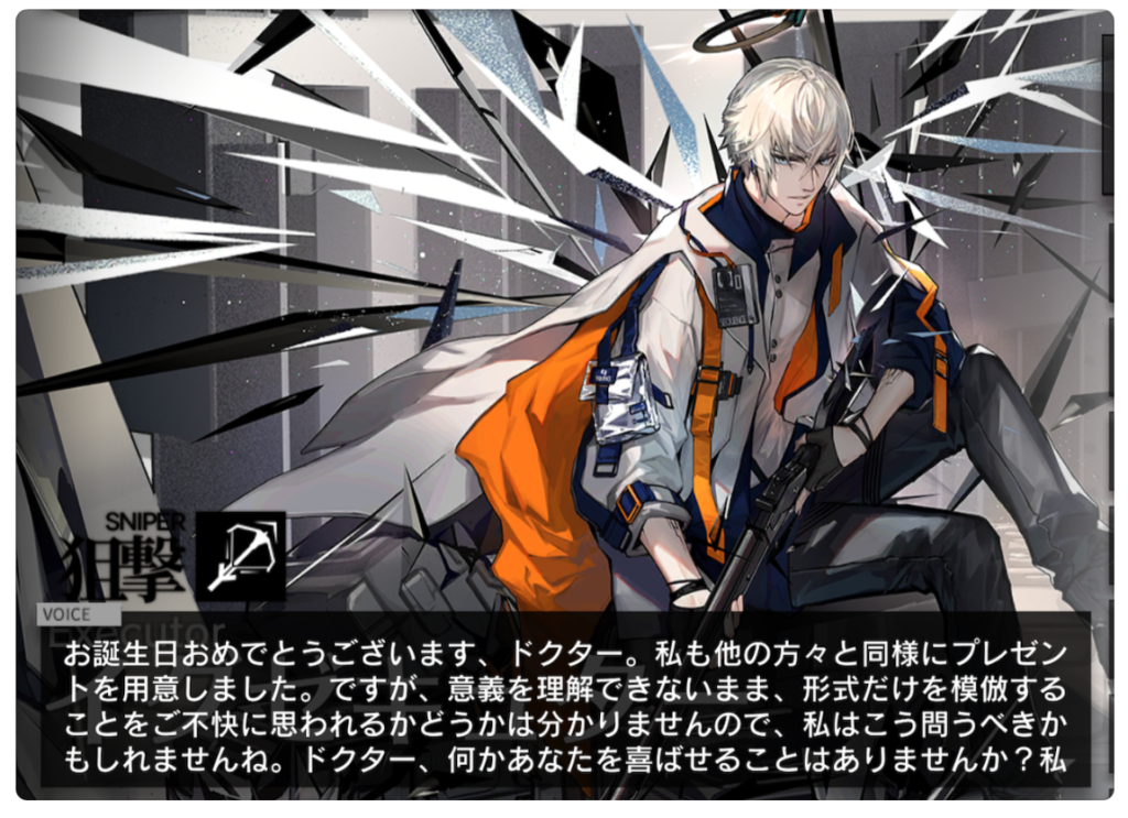 この記事はアークナイツの記念日ボイスのネタバレを盛大に含みますのでご注意ください。というか、ネタバレ見ない方がいいと思います。まだその日を迎えていない方は・・・その日を楽しみに待った方がいいと思う!あと、この記事はイグゼキュター推しの人間が書いているのでイグゼキュターの話が9割です。