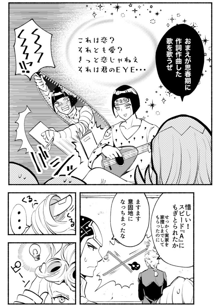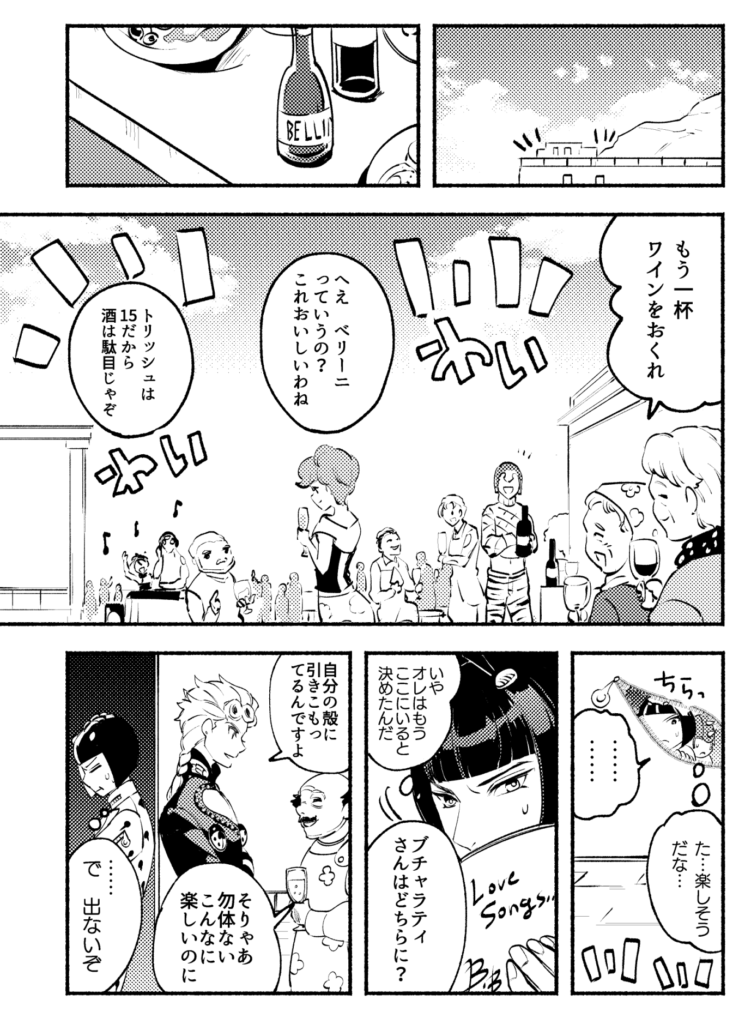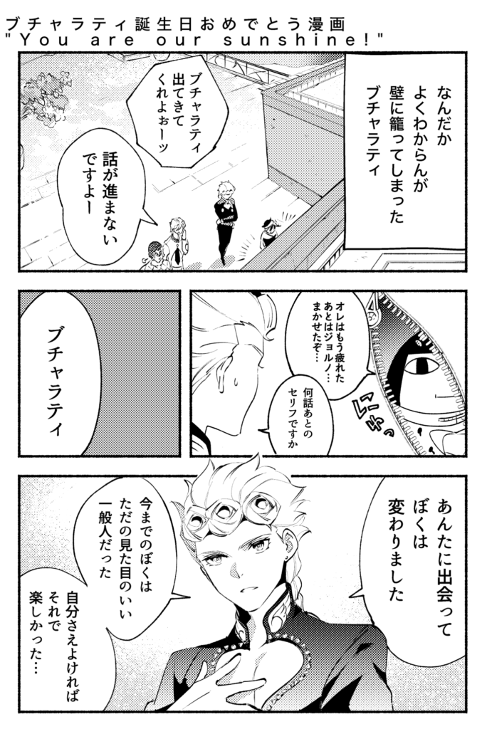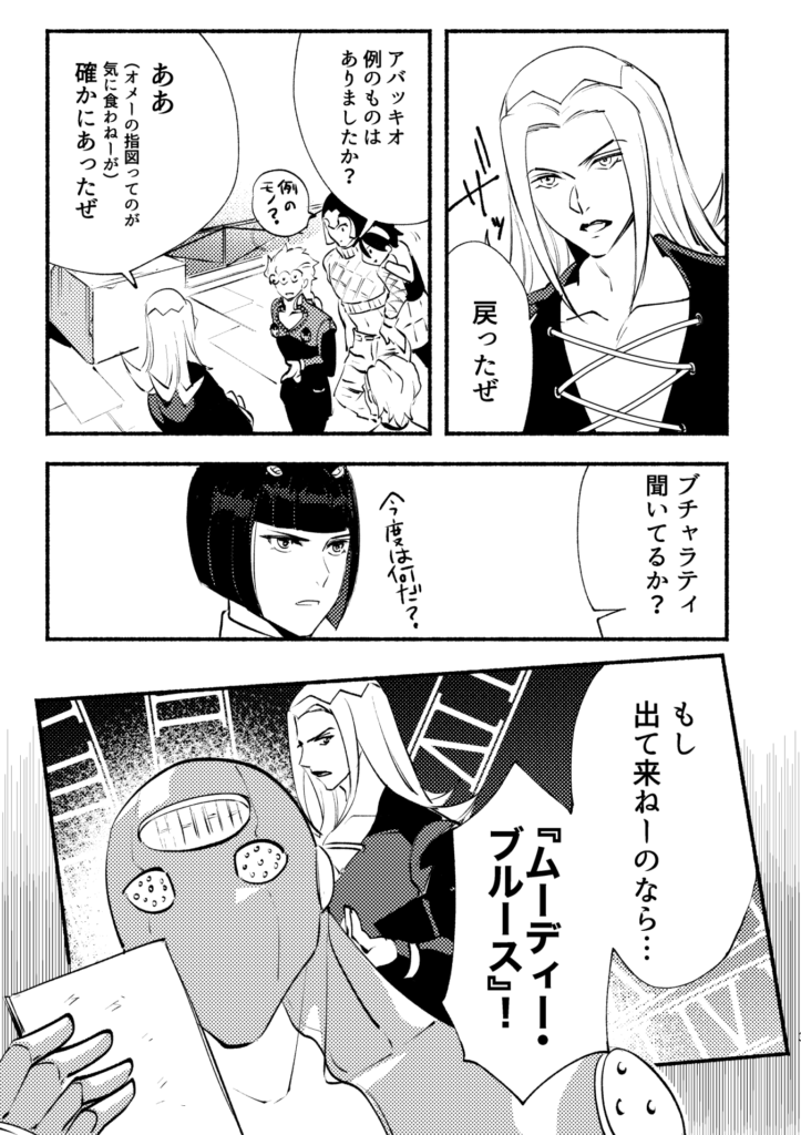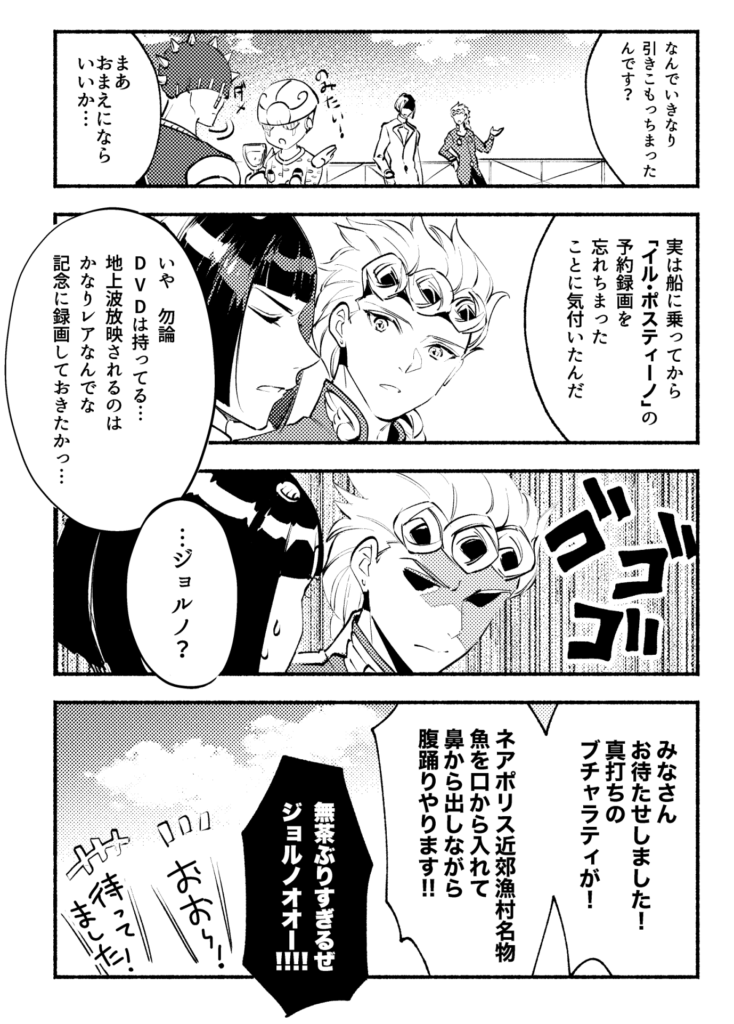 投稿者: mpnmisa2025年4月16日2025年4月16日 ブチャラティ誕漫画をジョルノの誕生日にひっそりUPするというD4C!前世でネームを切っており今世で描き直して仕上げた前世と今世の私のコラボ漫画となっております。なのでジョルブというかジョル&ブ!しかしなぜブチャラティの誕生日に魚を口から入れて鼻から出しながら腹踊りさせようとしたのか──?護衛チームのみんなってかっこいいよな・・・と噛み締めながら描いた漫画でもあります。
