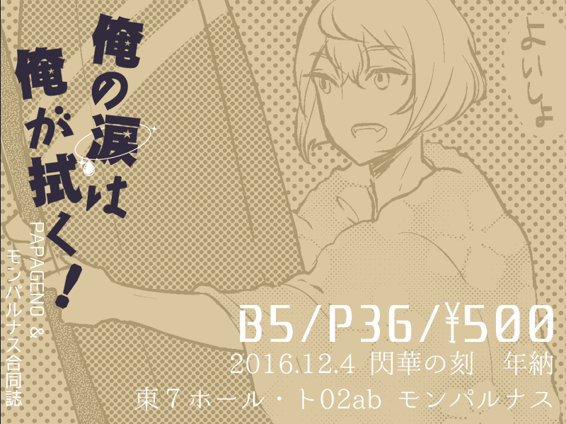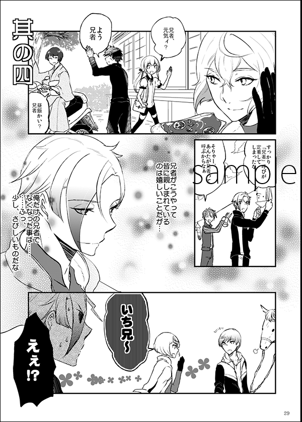 投稿者: mpnmisa2016年11月24日2026年4月2日 刀剣乱舞#06/源氏兄弟(髭切&膝丸)本/全年齢一般向 2016.12.4発行 B5/off/p36/¥500/完売 ❀彩辻さんと合同誌です。 →彩辻さんのサンプル カップリング要素なし、私の漫画は源氏兄弟+他のキャラのギャグです。彩辻さんとは11年ぶりの合同誌!