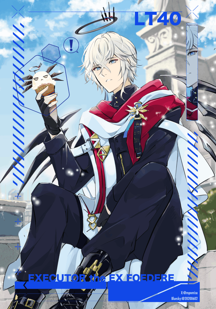 イグゼキュター誕生日イラストみたいなかっこいい雰囲気のをラフで描いていたんだけど「なんか私の描きたい聖約イグゼキュターと違う」ってなってこうなりました。
